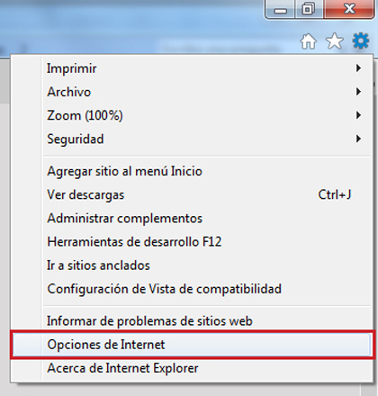 - Selecciona en la barra de menús del navegador la opción “Herramientas”, despliega el menú y haz clic en “Opciones de Internet”