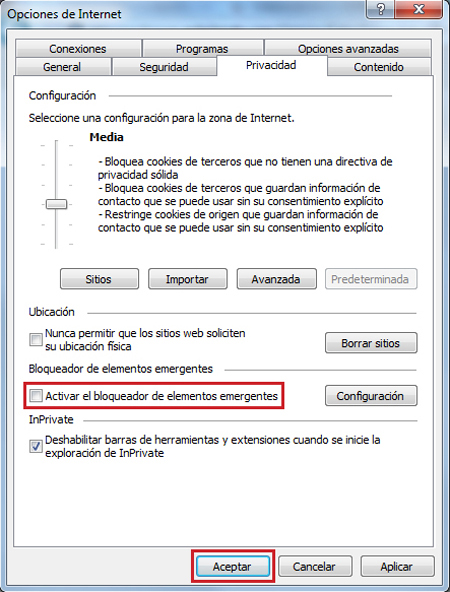 - En la pestaña "Privacidad", desmarca la opción “Activar el bloqueador de elementos emergentes”.