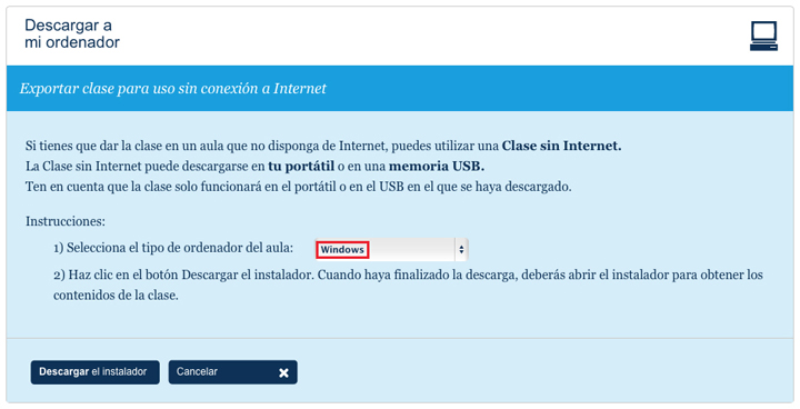 1. Elige la opción “Descargar a mi ordenador”. En la pantalla que aparece a continuación, escoge el tipo de sistema operativo (Windows) y haz clic en el botón “Descargar el instalador”.