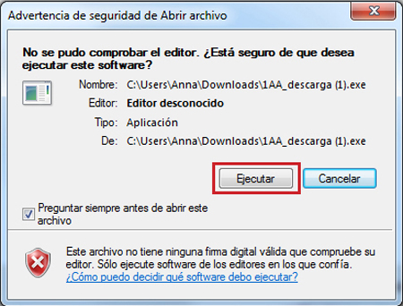 2. Al finalizar la descarga, haz doble clic en el archivo que aparece en la barra inferior del navegador. También puedes encontrar el archivo en la carpeta de descargas. Si te aparece un mensaje del sistema sobre la seguridad del archivo, selecciona la opción "Ejecutar".