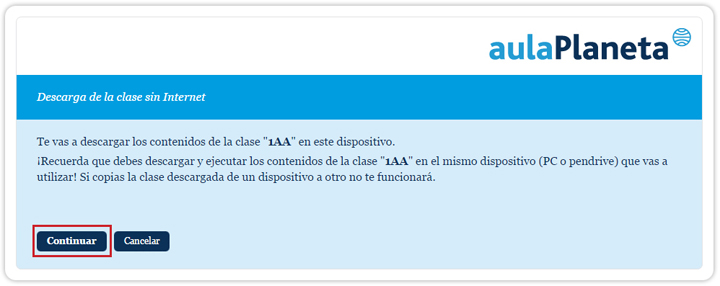 1. En la pantalla siguiente haz clic sobre el botón “Continuar” para iniciar la descarga de la clase. La descarga debe hacerse en el mismo dispositivo (PC o pendrive) que se vaya a utilizar posteriormente para visualizarla y estará activa durante un mes.