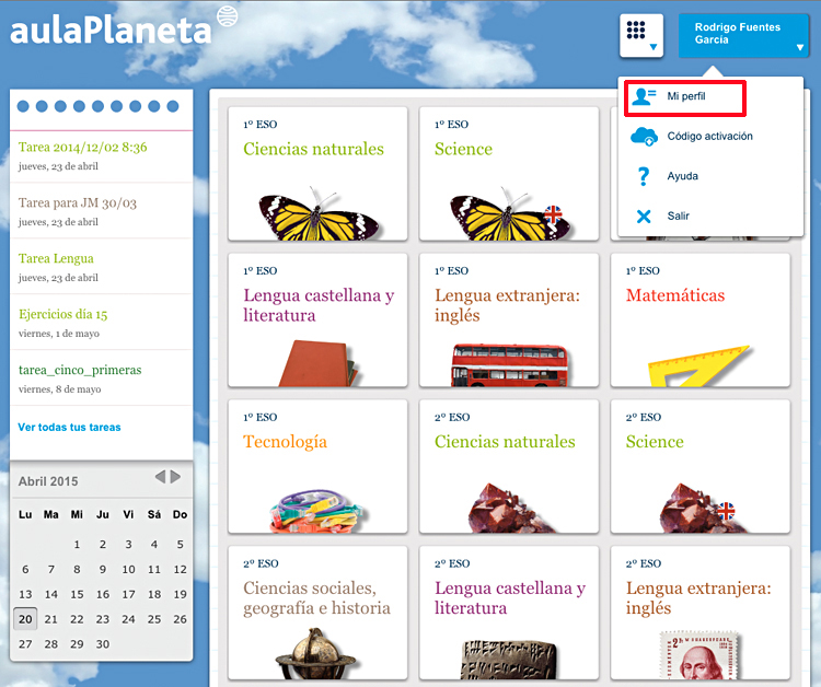 Puedes acceder a tu perfil de usuario de aulaPlaneta desde la página principal de la plataforma. Para ello, haz clic en tu nombre, situado en la parte superior derecha de la pantalla y, en el menú desplegable, selecciona la opción “Mi perfil”.