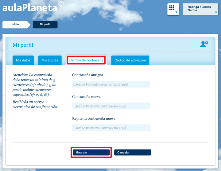Si lo deseas, puedes modificar tu clave de acceso a aulaPlaneta en la pestaña "Cambio de contraseña". Completa los campos siguiendo estos pasos: