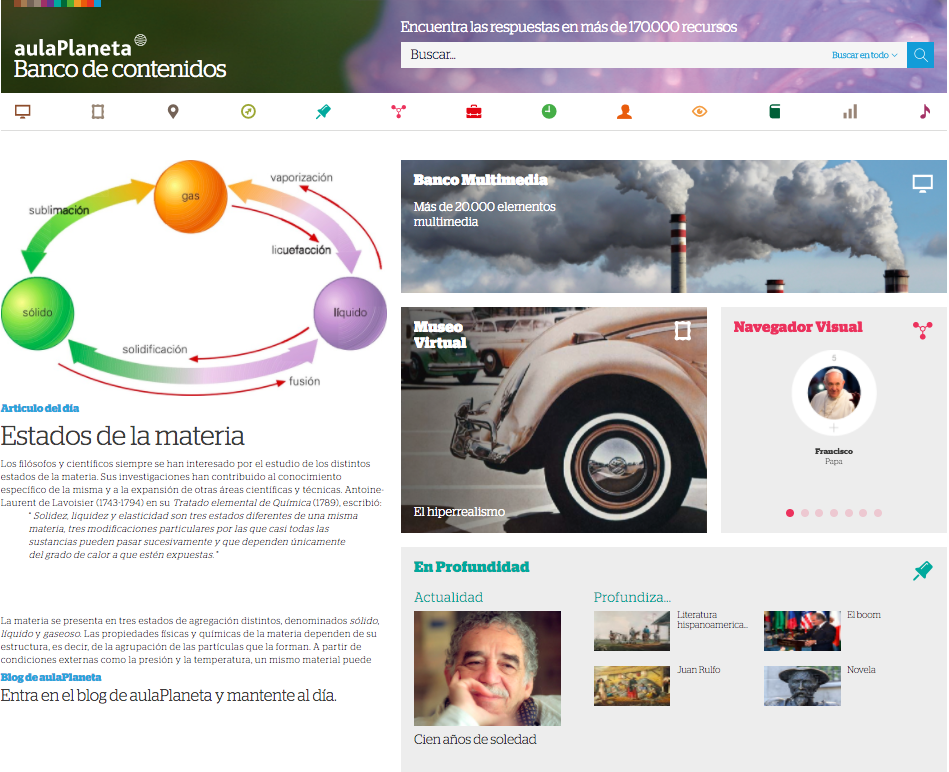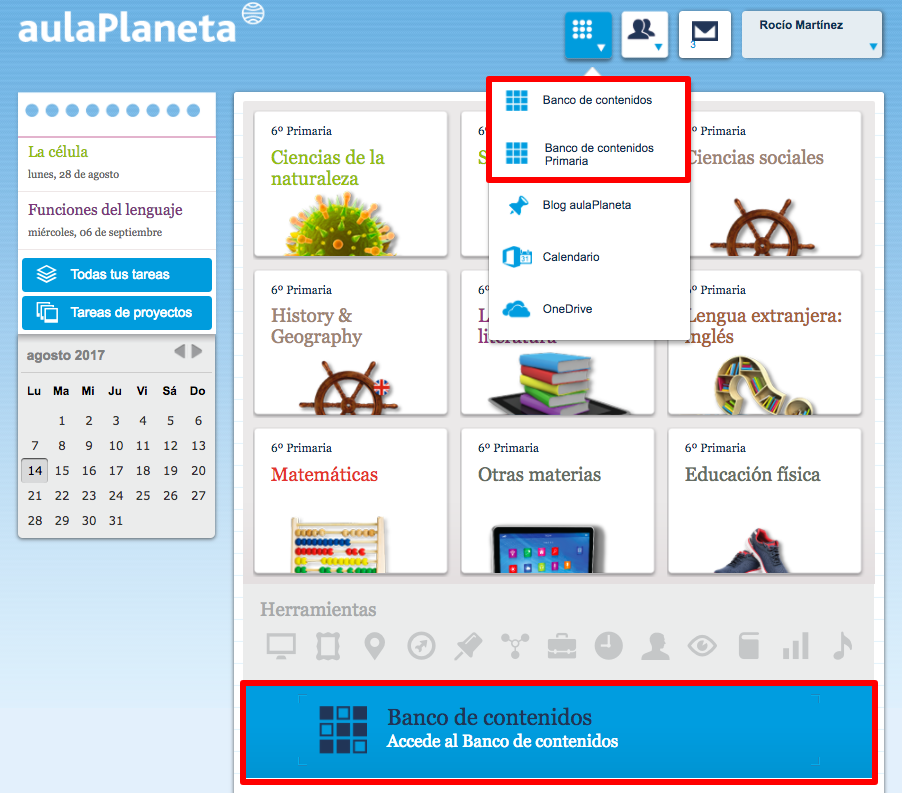 Para acceder al Banco de contenidos de aulaPlaneta debes hacer clic en el icono ubicado en el extremo superior derecho de la pantalla; también puedes utilizar el acceso directo al final de la pantalla principal.