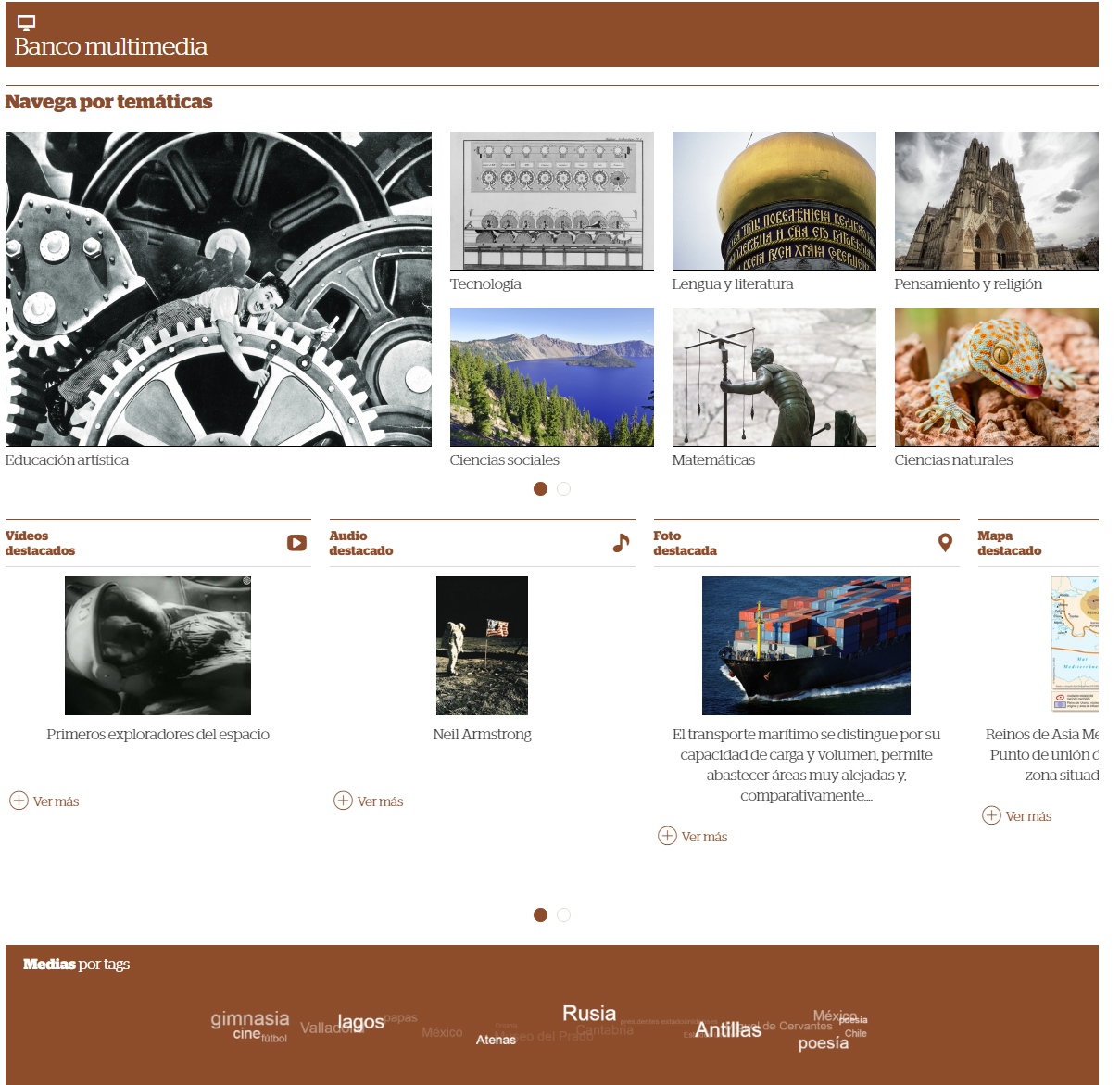 El Banco multimedia es un espacio donde puedes encontrar más de 20.000 recursos multimedia catalogados por temáticas y por tipo de contenidos (videos, audios, fotos y mapas) para facilitar la navegación. También incluye una nube de tags con los términos de los recursos multimedia más buscados.