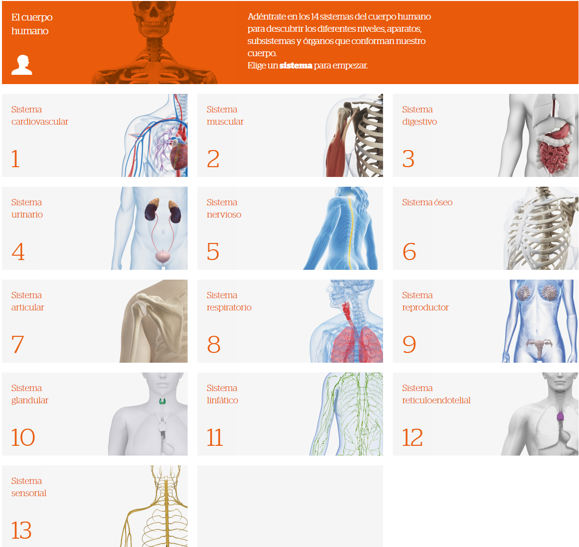 El Cuerpo humano es un espacio que recorre los distintos sistemas y aparatos del cuerpo y ofrece contenidos teóricos y recursos multimedia sobre los distintos órganos y elementos que los conforman.