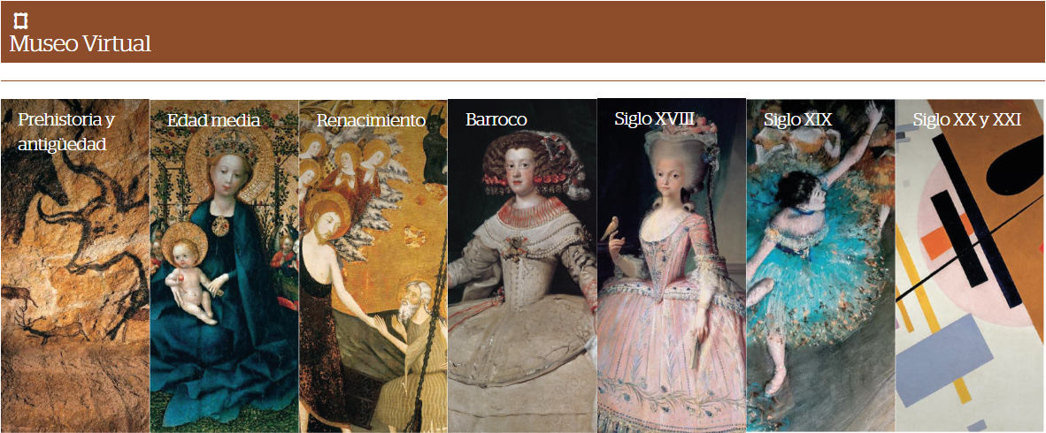 El Museo virtual es una sala de recursos artísticos organizados por épocas: prehistoria y antigüedad, edad media, renacimiento, barroco, siglo XVIII, siglo XIX, siglo XX y XXI. Cada período se estructura a su vez en nuevos apartados y movimientos donde encontrarás imágenes e información sobre obras, estilos y artistas.