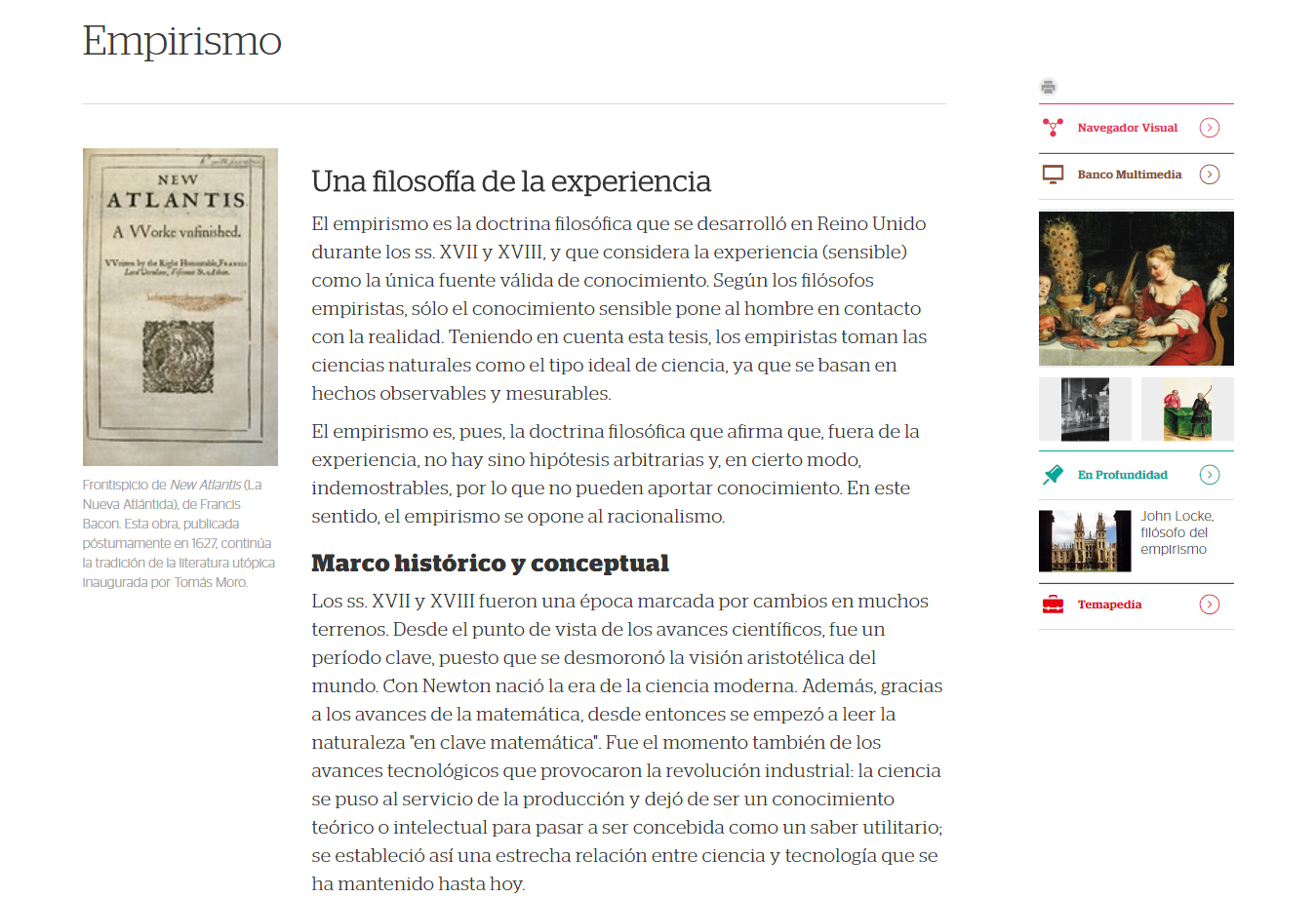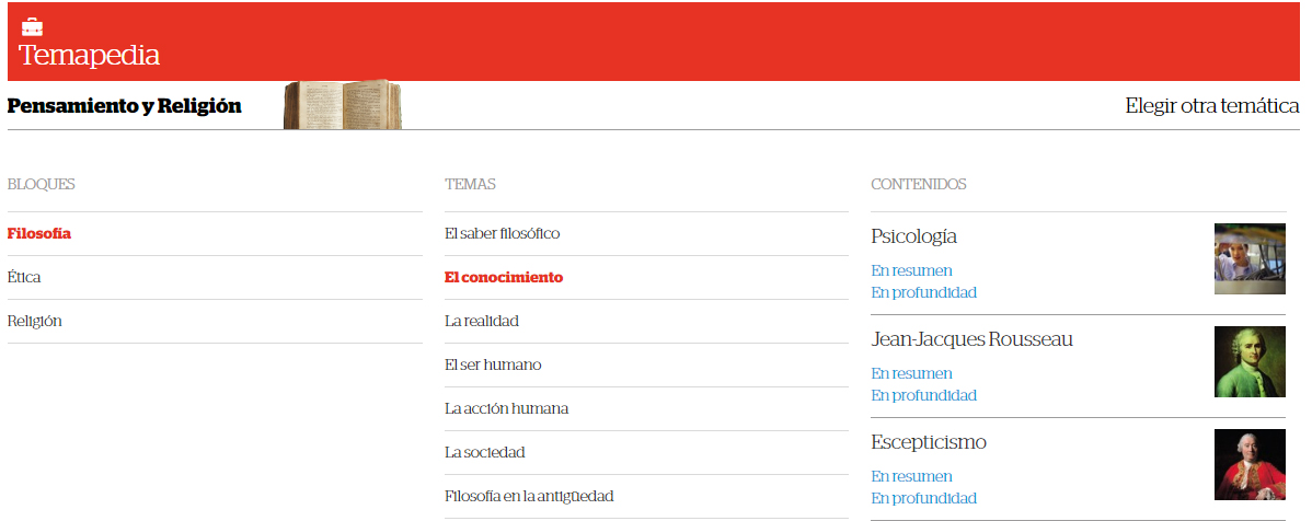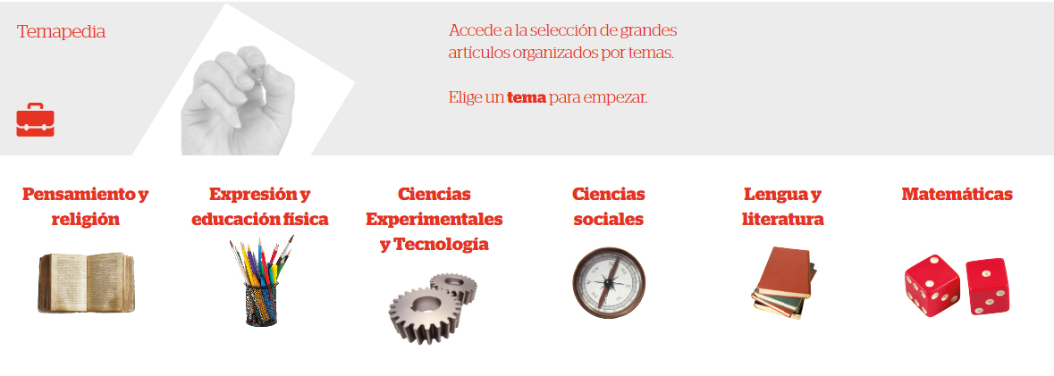 La sección Temapedia ofrece una selección de información y artículos temáticos de carácter educativo organizados por áreas: pensamiento y religión, expresión y educación física, ciencias experimentales y tecnología, ciencias sociales, lengua y literatura y matemáticas. La información dentro de cada una se estructura a su vez en bloques, temas y contenidos.