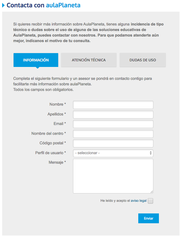 En aulaPlaneta estamos siempre disponibles para resolver tus dudas técnicas o de uso de nuestras plataformas. Puedes ponerte en contacto con nosotros para plantear dudas, sugerencias o notificar incidencias a través del formulario de contacto de aulaPlaneta.