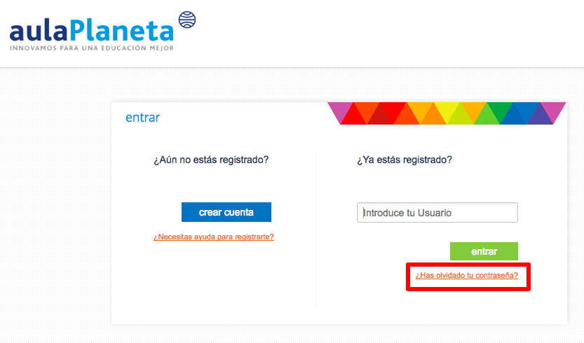1. A través de la página de registro de aulaPlaneta http://registro.aulaplaneta.com. Solo tienes que hacer clic en “¿Has olvidado tu contraseña?” y serás redirigido a un formulario donde deberás introducir tu nombre de usuario y pulsar “Enviar”. El sistema te enviará un correo electrónico para cambiar tu contraseña.