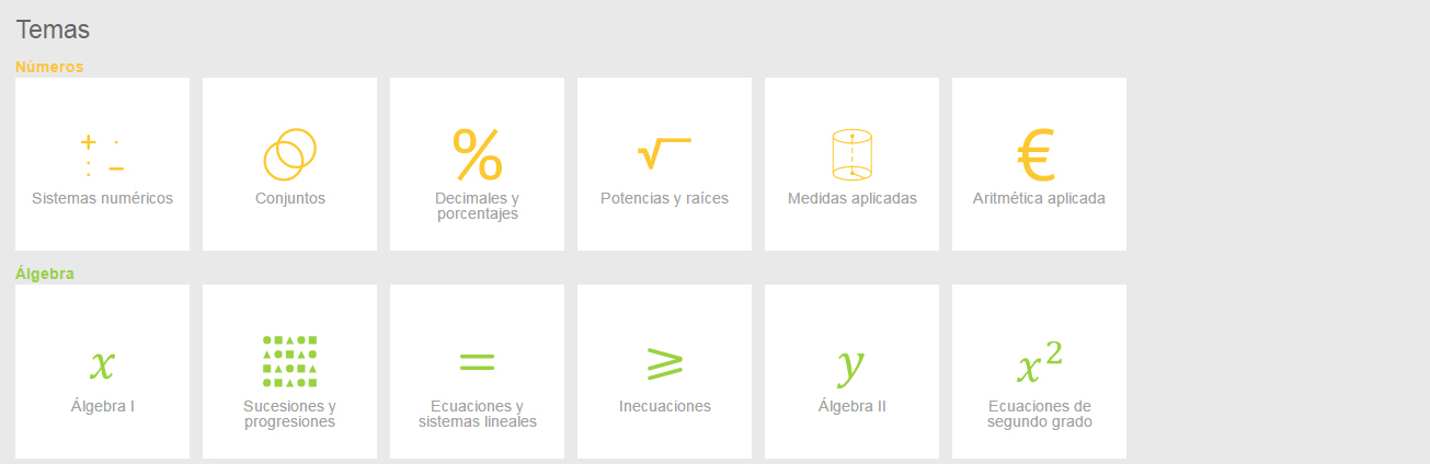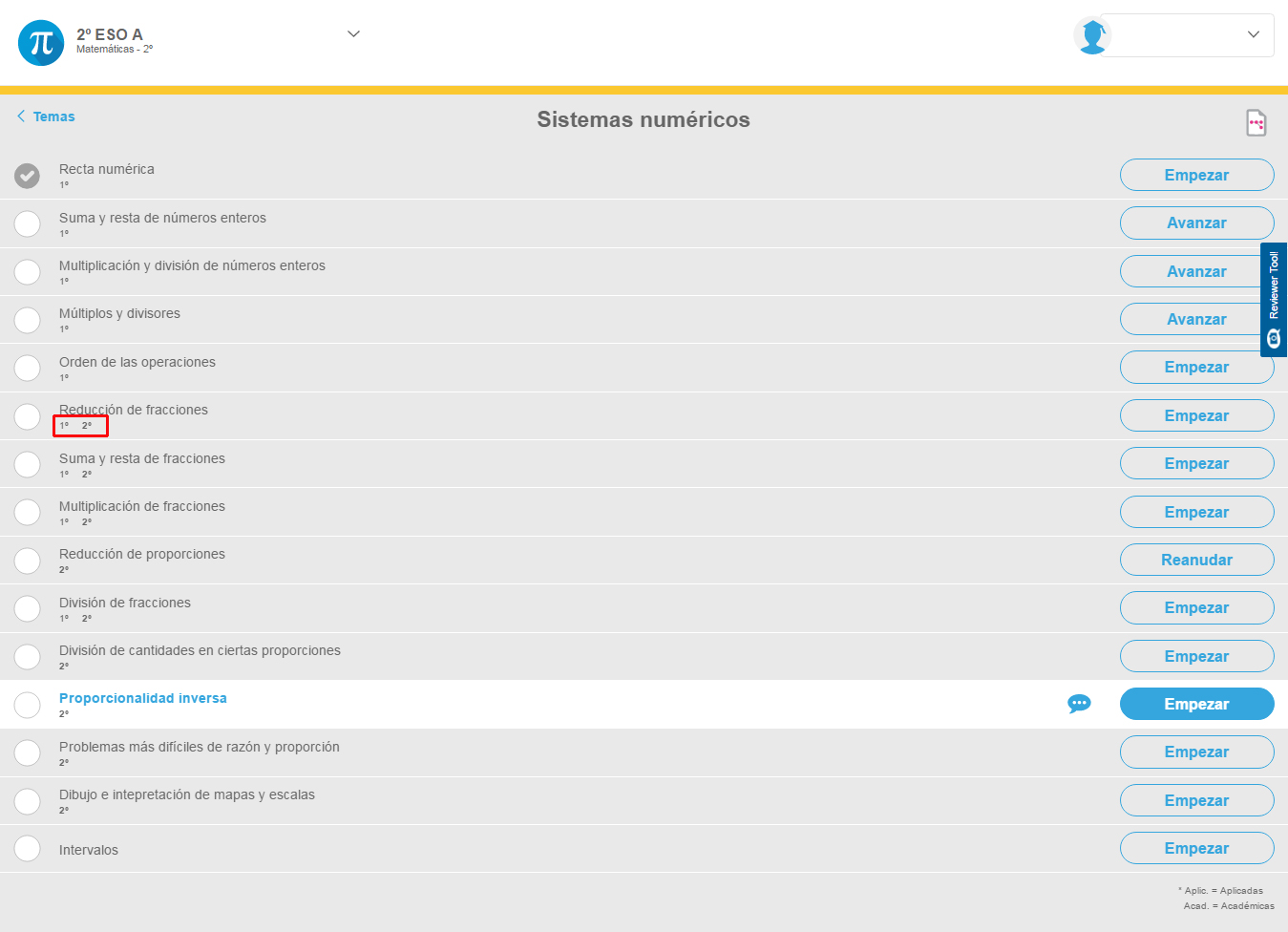 Ya que la información sobre los cursos a los que va dirigido cada concepto distinguen entre matemáticas aplicadas y académicas en 3º y 4º de ESO, los alumnos inscritos en una clase de matemáticas aplicadas o académicas visualizarán solo la información sobre el curso sin especificar si se trata de aplicadas o académicas; el sistema automáticamente mostrará la que le corresponda a cada alumno según su elección: 3º Aplic., 3º Acad., 4º Aplic. o 4º Acad. Los alumnos de 1º y 2º, en cambio, visualizarán todas las opciones de 3º y 4º al no estar inscritos en una de ellas.